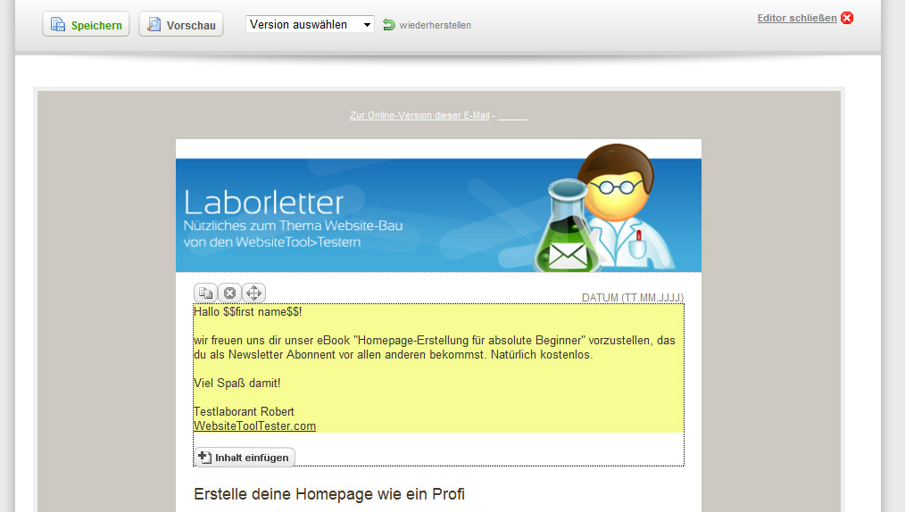 | -Personalisierung | Menügesteuert per Editor, kein Regeleditor für wenn/dann Verknüpfungen, Abonnenten können ihre Kontaktdaten nicht selbst aktualisieren. | |